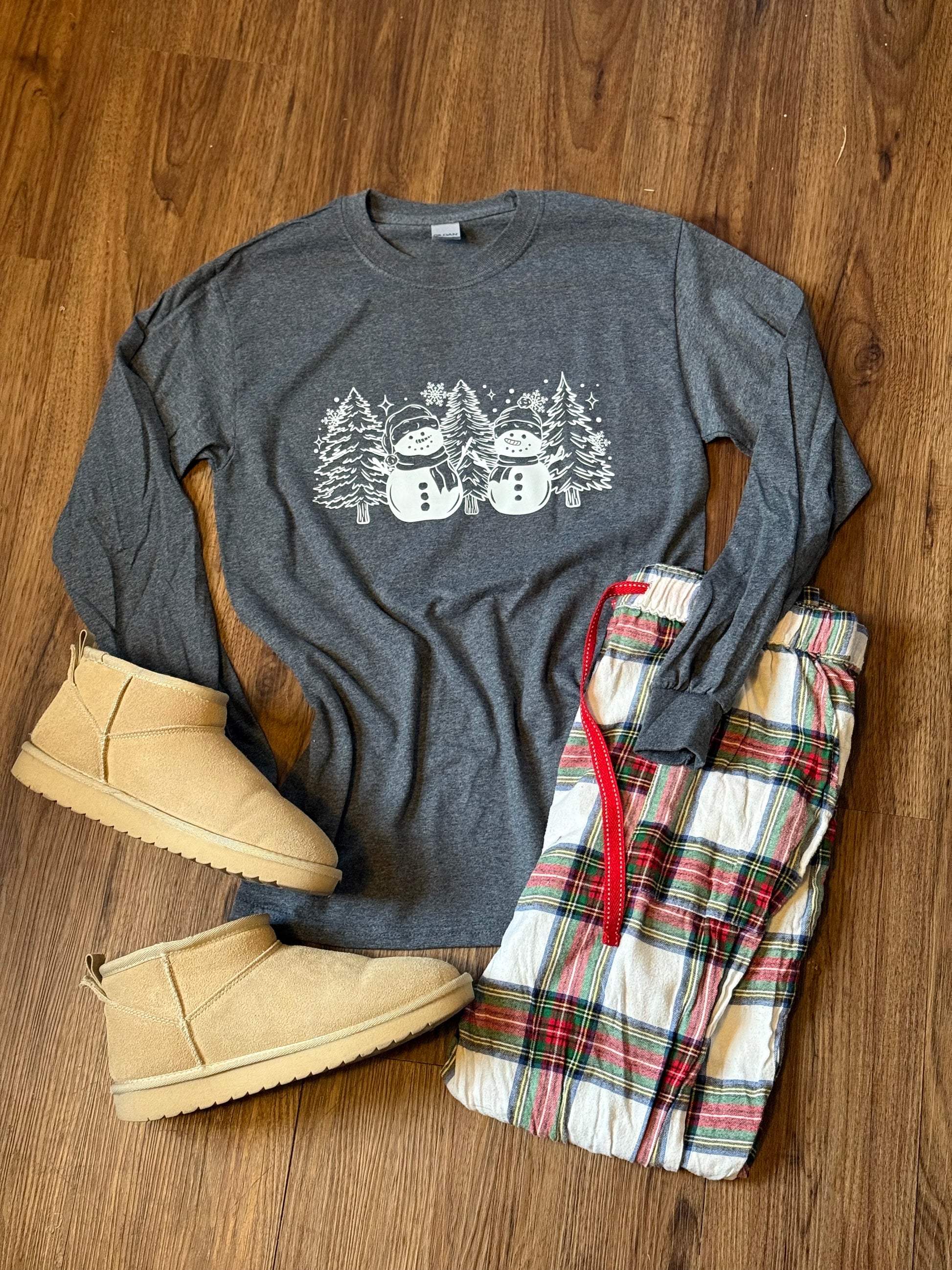 Cozy, classic, and perfectly festive — this dark heather gray long sleeve features a charming snowman design that adds just the right touch of holiday cheer. Made with a soft, lightweight fabric that’s comfortable for all-day wear, it’s ideal for layering, lounging, or celebrating all season long.